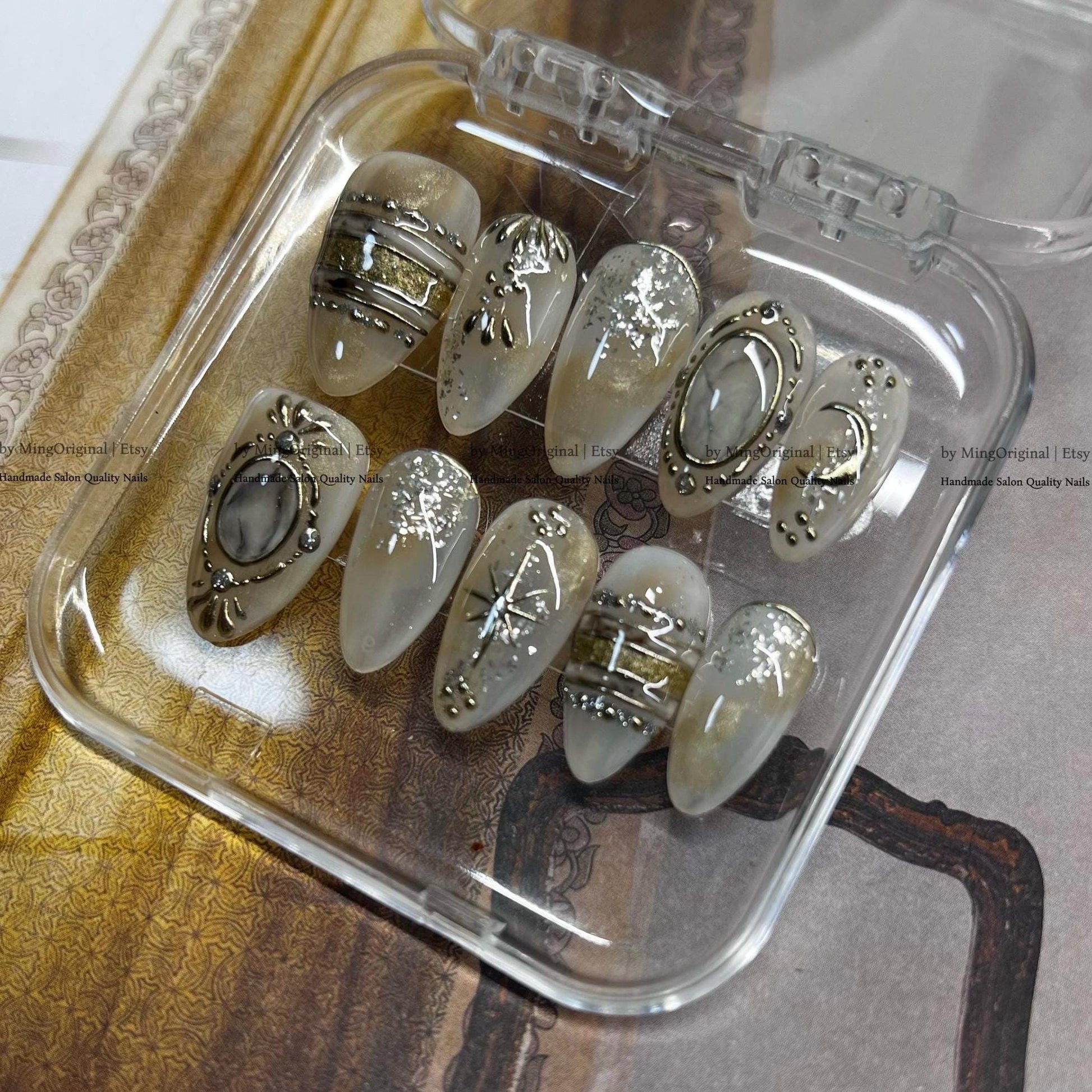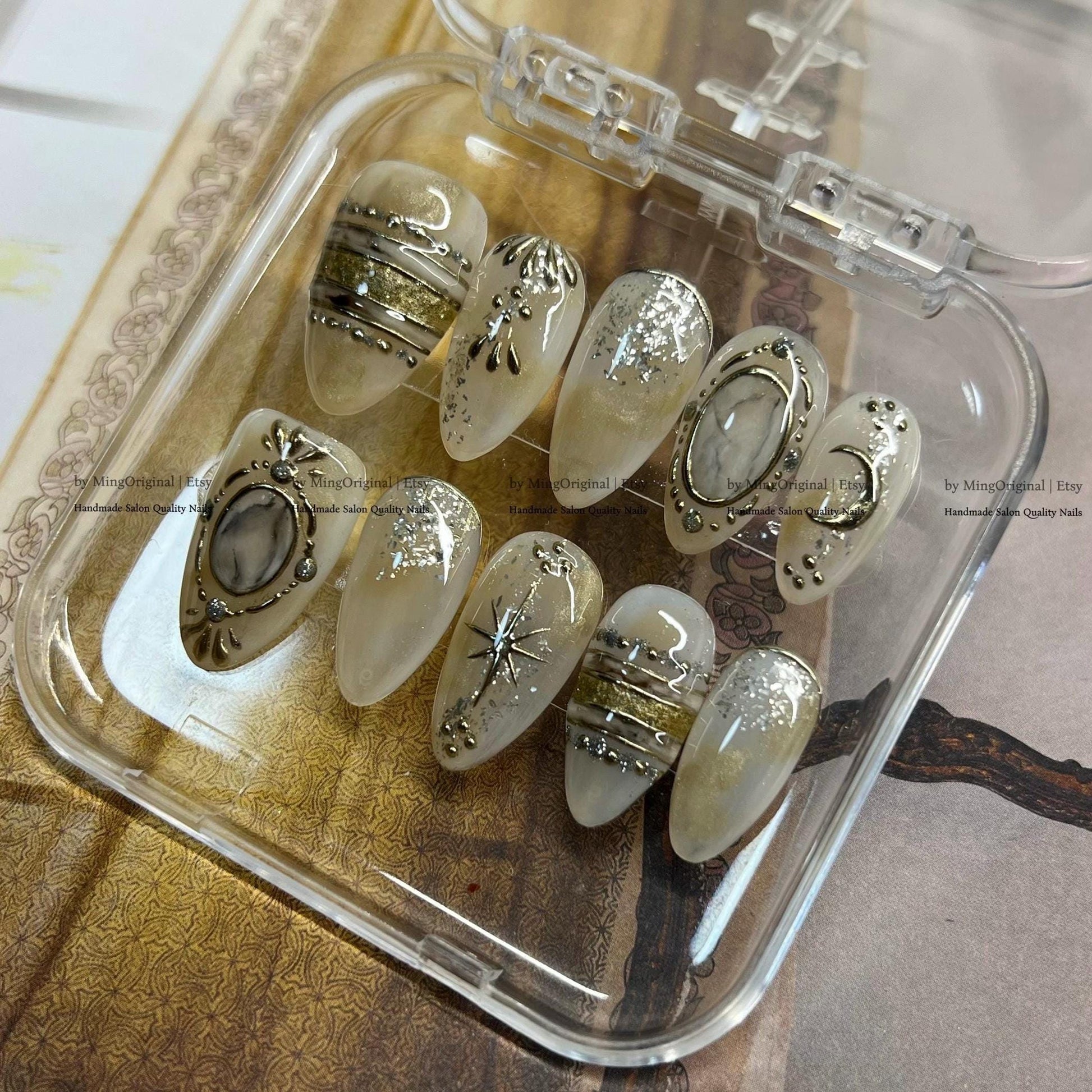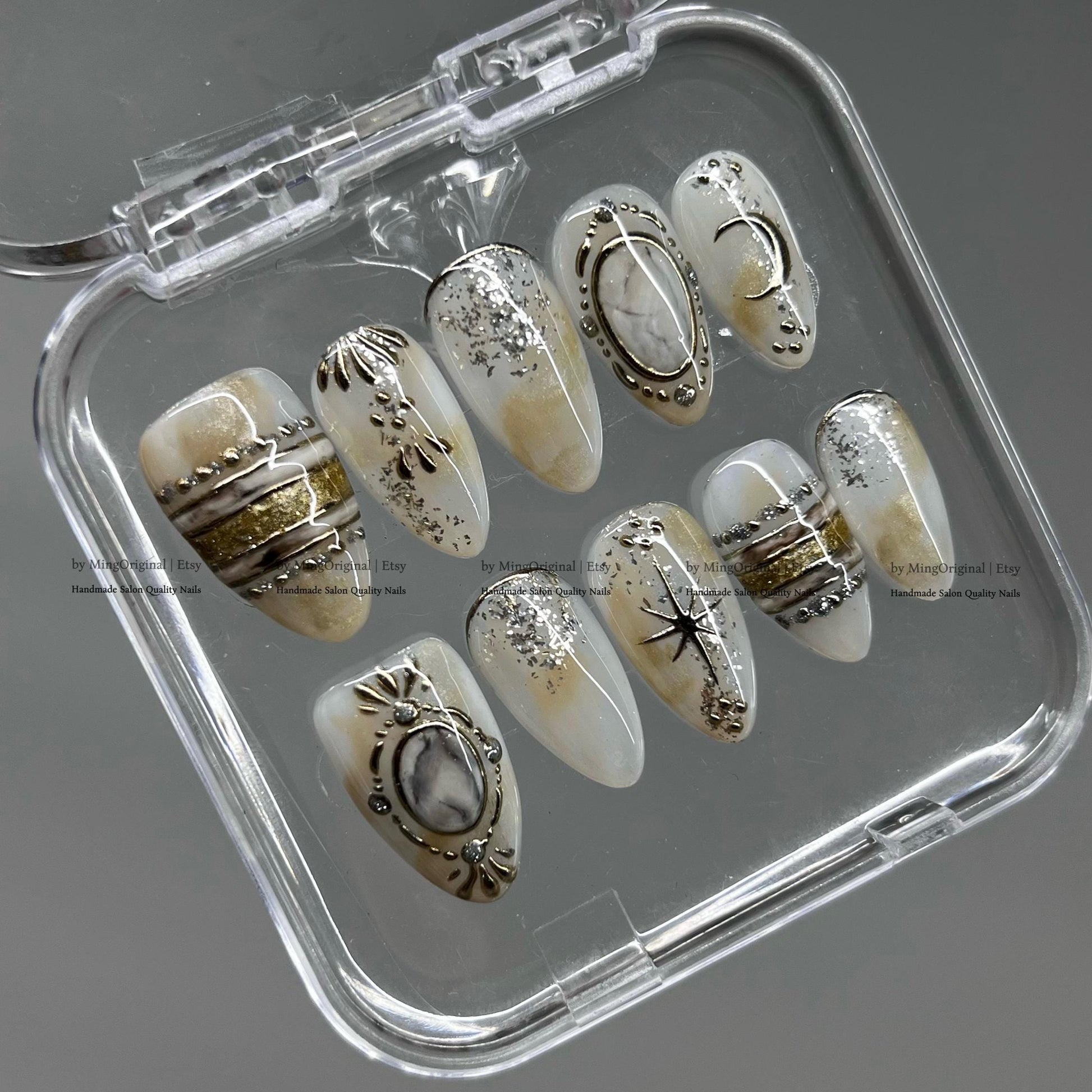 Celestial Moon Star Press On Nails, Silver Marble Fake Nails, Mystic Galaxy Boho Gel Nails, MO836