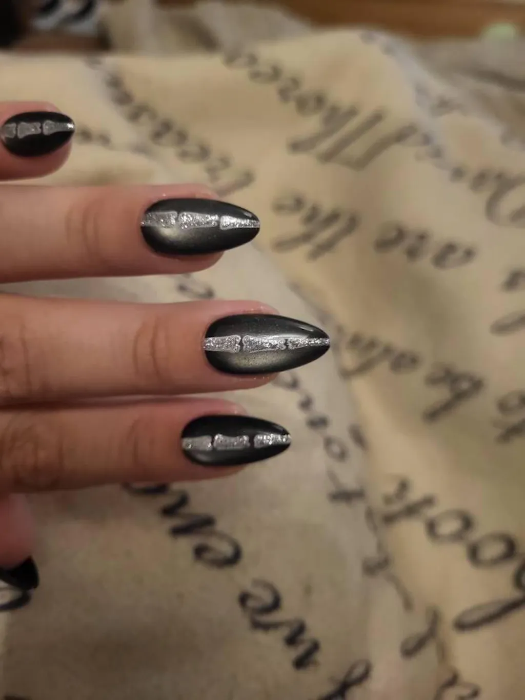 Halloween Shadow Spine Bone press on nails, black cat eye base, silver glitter bone design, spooky season sparkling Gothic nail art, MO615